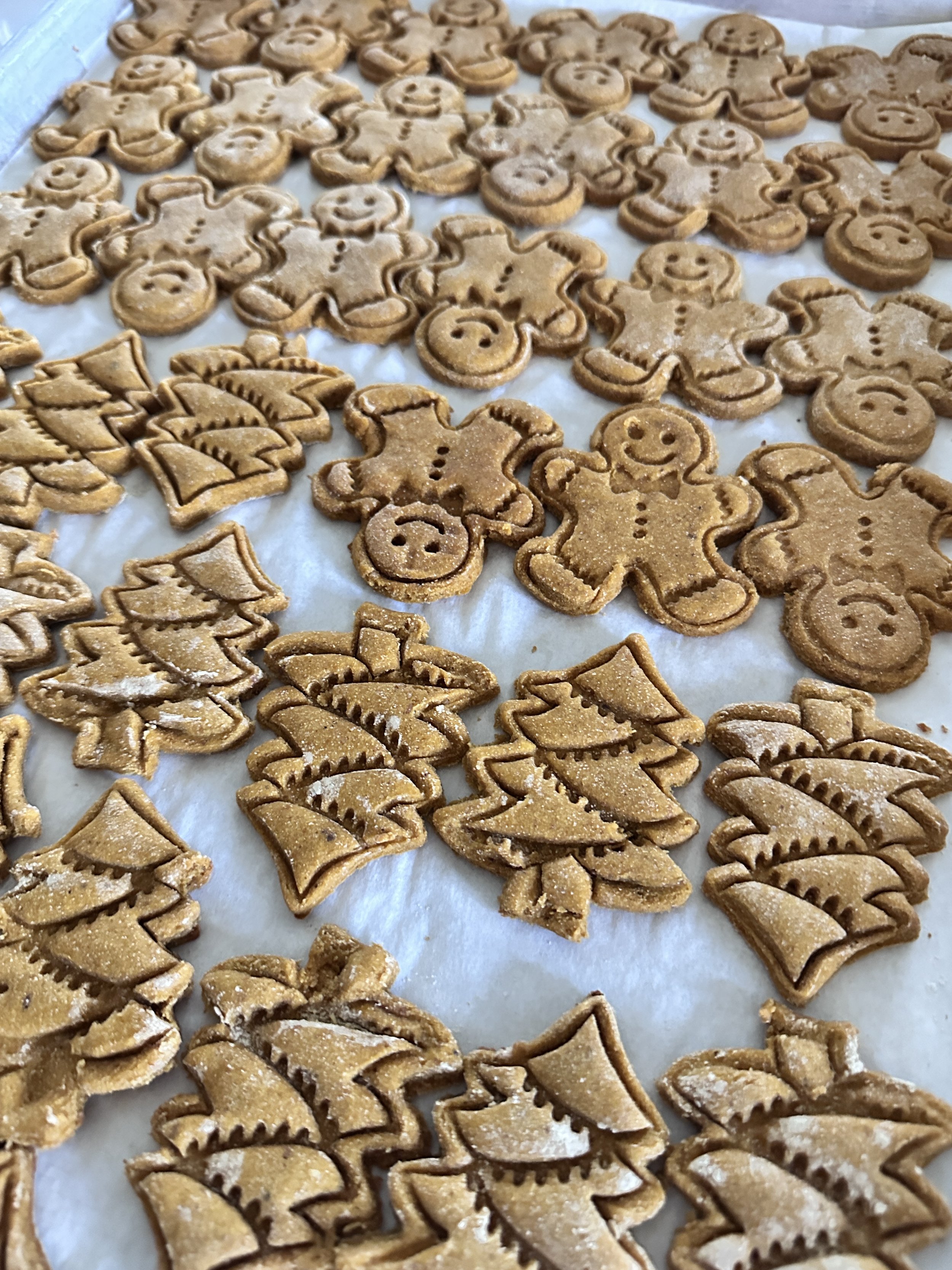 Christmas Cookies freshly baked and hand-cut with fun howliday shapes, made with chickpea flour, pumpkin and peanut butter. Makes for great holiday photos with your pup!